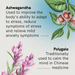 - KSM-66® ashwagandha: A highly concentrated and specialised extract used to promote the body’s ability to cope with stress, decrease stress symptoms and relieve symptoms of mild anxiety.
